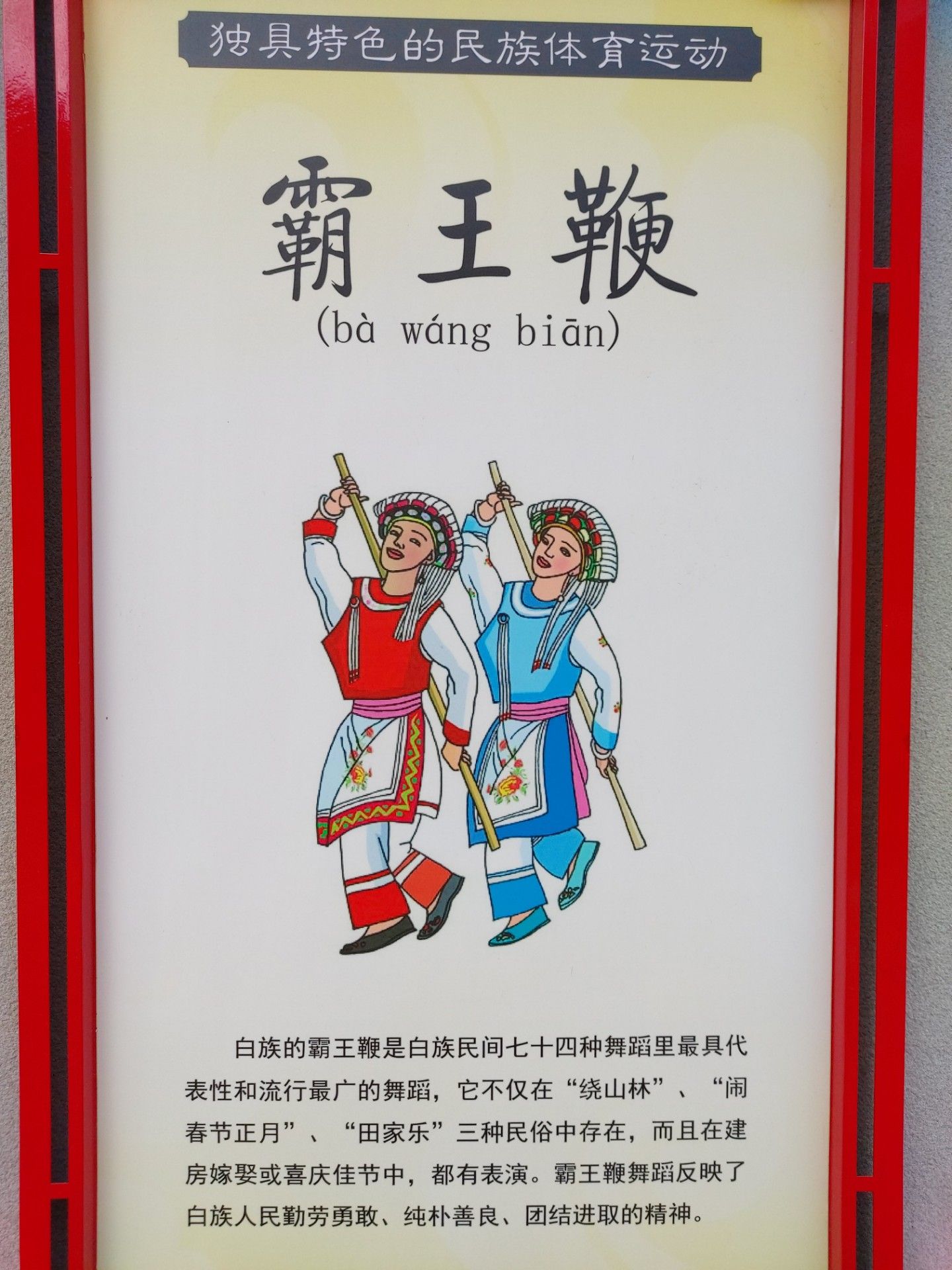 白族的霸王鞭是白族民间七十四种舞蹈里最具代表性和流行最广的舞蹈,它不仅在“绕山林’”、“闹春节正月”、“田家乐” 三种民俗中存在,而且在建房嫁娶或喜庆佳节中,都有表演。霸王鞭舞蹈反映了白族人民勤劳勇敢、纯朴善良、团结进取的精神。