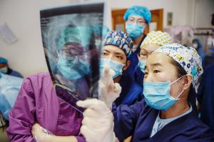 北京援藏医生韩同英(右一)在北京市组团帮扶的拉萨市人民医院对当地医生进行传帮带。