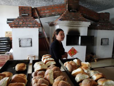图片说明:村民烤制的俄罗斯族传统食品列巴
